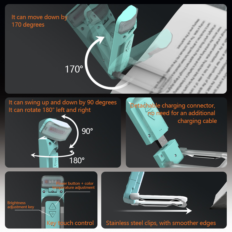 Adjustable Brightness Book Light,experience tailored reading comfort with the EGH Cyan USB Book Light, featuring three adjustable color temperatures and dimmable brightness for personalized, eye-friendly illumination in a sleek, portable design.
